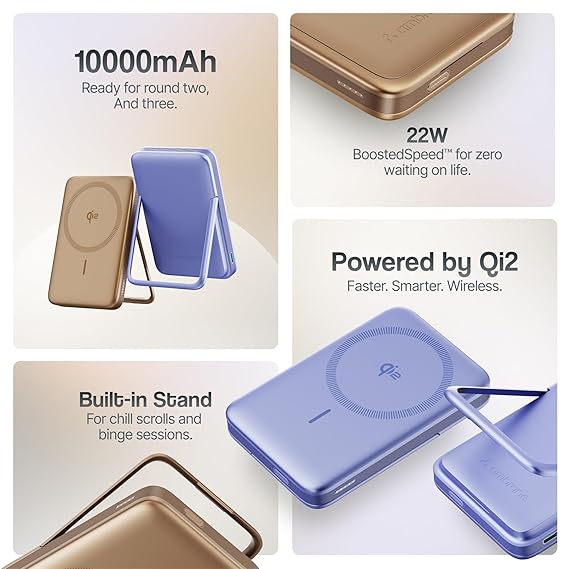 Ambrane Qi2 Magsafe Wireless 10000mAh Powerbank, Faster 15W Wireless Charging, Better Magnetic Strength (Golden)