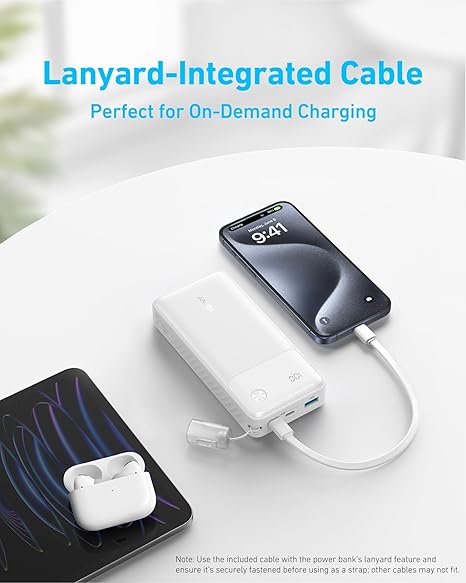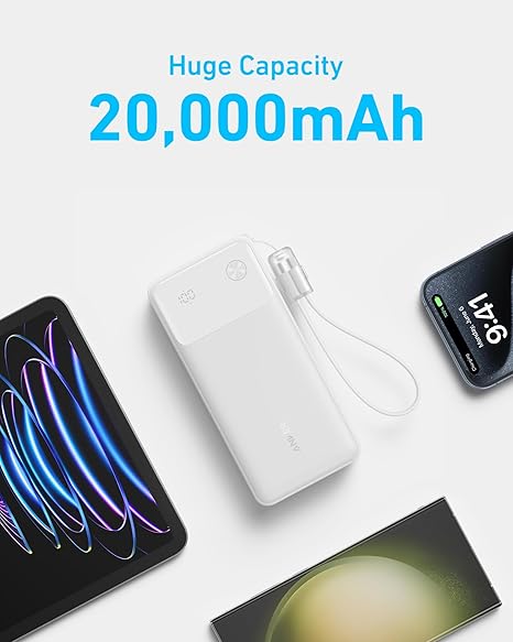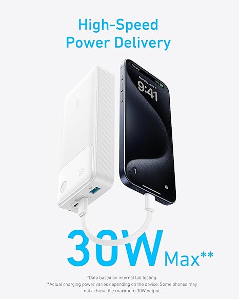 Anker Power Bank 20000 mAh with 3-Port 30W Max PD Fast Charge, Compatible iPhones, iPads, Macbooks, Samsung Smartphones and Other Android Devices - White