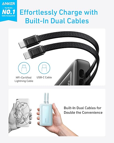 - Dual Cables Built-In: Charge effortlessly with dual built-in cables, including an MFi-certified Lightning cable and a USB-C cable. These cables are tested to last over 10,000 bends for long-lasting use.
