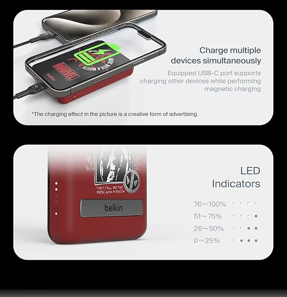 Belkin X Deadpool | 5000 mAh Magsafe Wireless Power Bank | 10W w/Wired & 7.5W Wireless Fast Charging | Compatible w/iPhone 12 and Above, Android Devices & Airpods