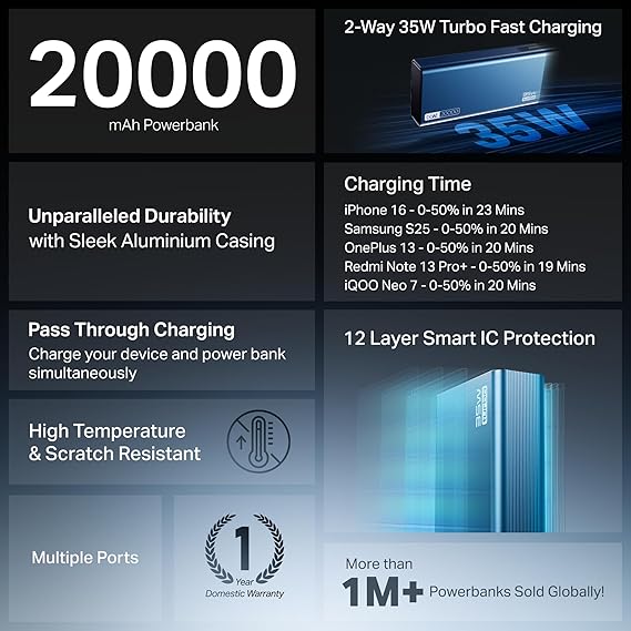 boAt Newly Launched PB435 Turbo 35W Power Bank with 20000mAh Battery, 35W 2-Way Super Fast Charging | 12-Layer Smart IC Protection | Triple Output & Dual Input in Sleek Aluminium Casing(Navy Blue)