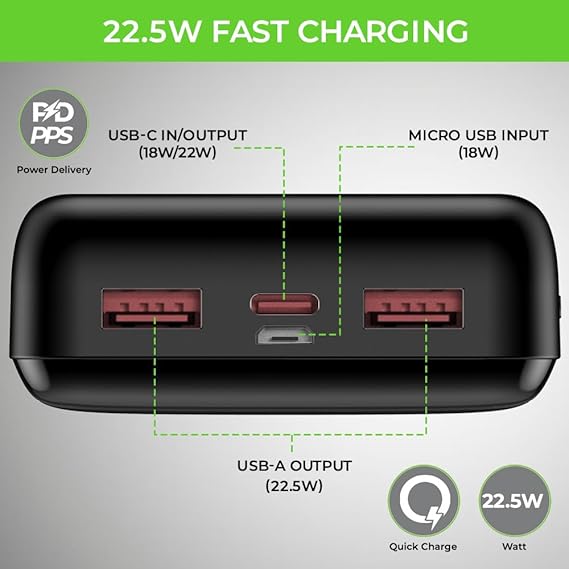 USB-A Ports with 22.5W Super Fast Charging : The two USB-A ports support QC3.0 & Fast Charging, delivering up to 22.5W. Compatible with QC3.0 devices, iPhones, and FCP/AFC capable devices. Ideal for all smartphone brands which use the Quick Charge protocol