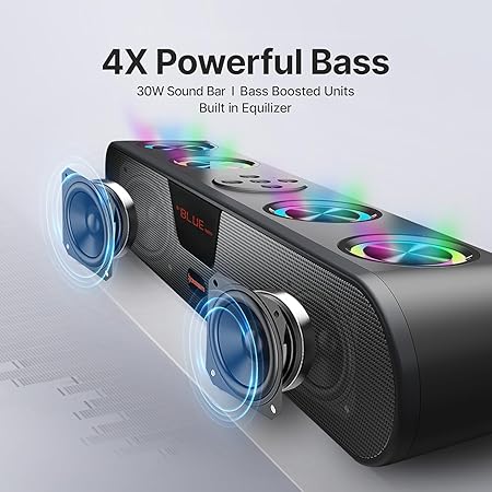 - [RGB LIGHTS]: Amp up the party with these flashy RGB lights. The vibrant lighting improves both the music and game dynamics experiences. The control button on the sound bar allows you to turn on and off the LED light. Suitable for your monitor's games, movies, and music.