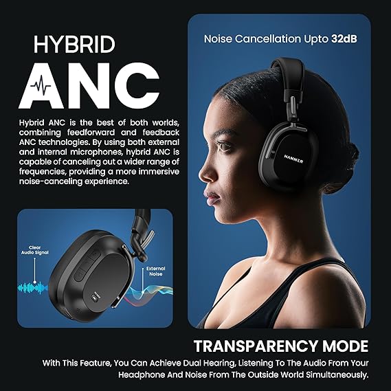 HAMMER Bash Pro 33 dB Hybrid ANC Over Ear Wireless Headphones, 4 Mics for Clear Calling, Charge 10mins = 300mins playtime (Black)