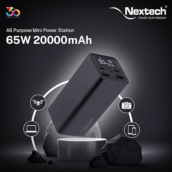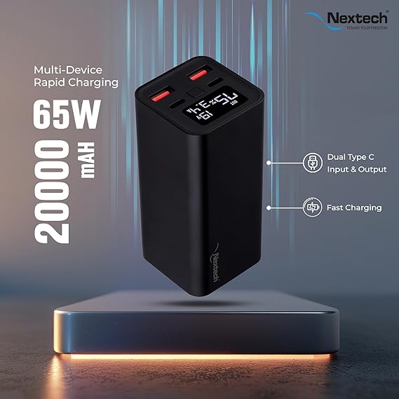 Nextech Tower 20000 mAh 65W Fast Charging Power Bank | Universal & Portable | Laptop PowerBank | Universal Powerbank for iPhone, MacBook, Tablet, Smartphone | Power Bank 20000mAh Fast Charging USB-C
