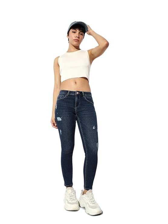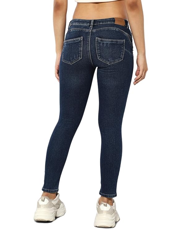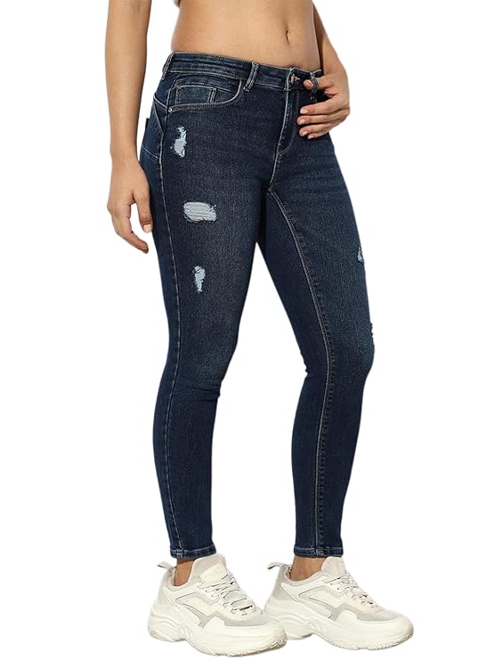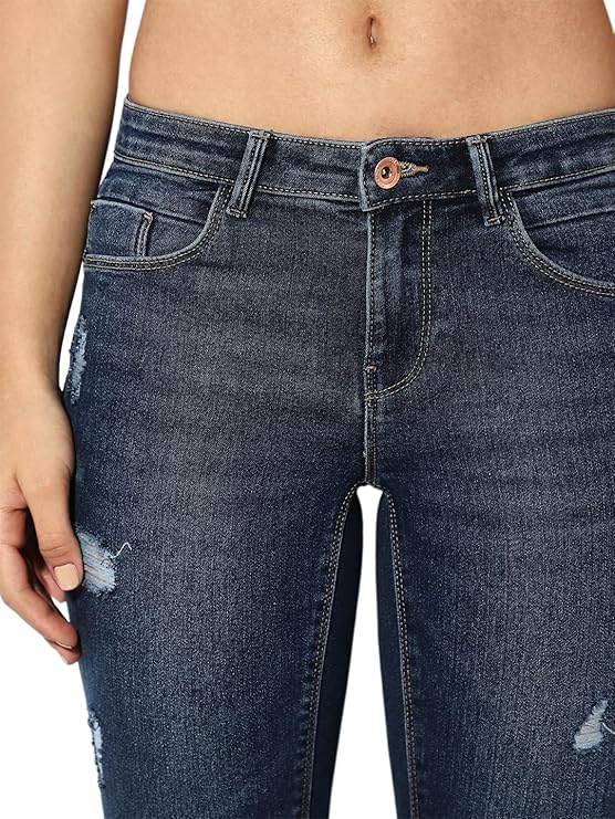 ONLY Women High Rise Skinny Fit Mildly Distressed Light Fade Stretchable Jeans (Dark Blue Denim)