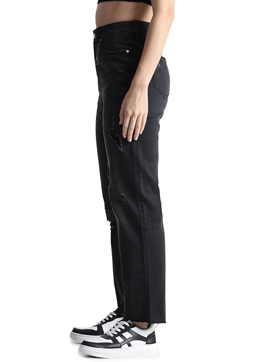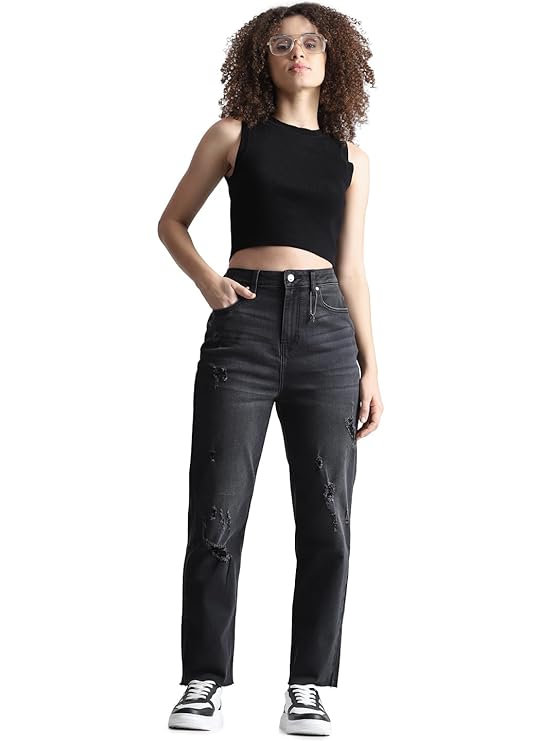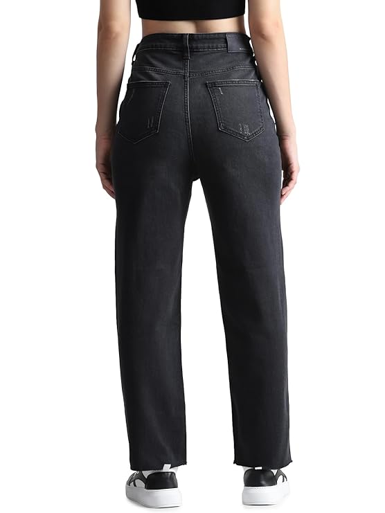 ONLY Women Mom Fit High-Rise Low Distress Light Fade Pure Cotton Jeans (Black)