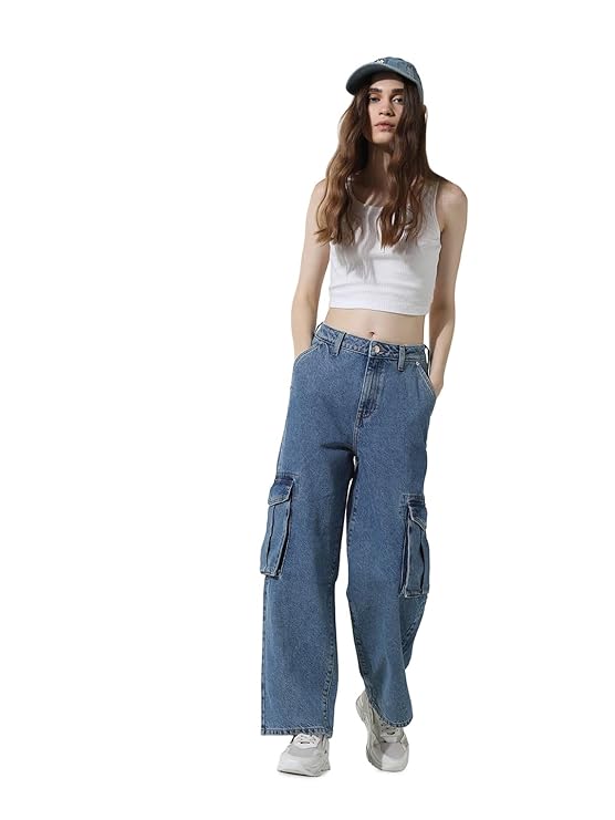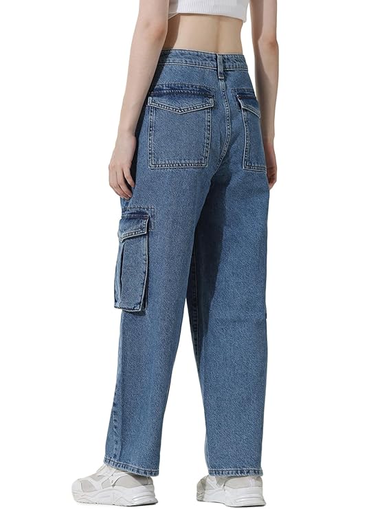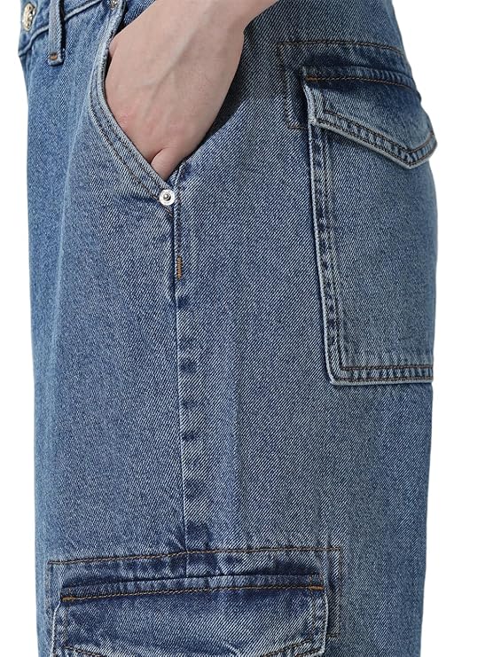 ONLY Women's Cargo Denim Jeans | High Rise Stretchable Straight-Fit Denim| Boyfriend Jeans for Women ( Medium Blue Denim)