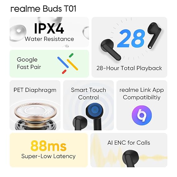 realme Buds T01 Truly Wireless in Ear Earbuds with AI ENC for Calls, 13mm Dynamic Driver, Upto 28Hrs Battery,88mm Latency,Bluetooth V5.4 & Google Fast Pair (Black)