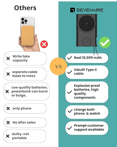- 【15W Fast Charging】 : Experience the ultimate convenience with our Sevenaire Mag-safe Power bank. Designed specifically for the iPhone 16/15/14/13/12 series and iWatch 10 to 3. it delivers lightning-fast charging speeds, keeping you powered up and ready to go in no time. also compatible with Android phones that support Qi wireless charging.