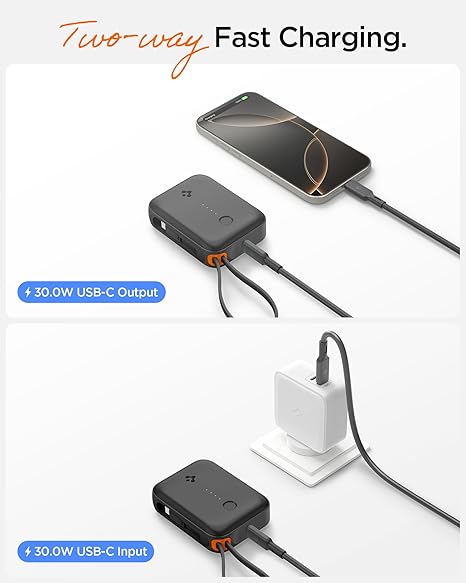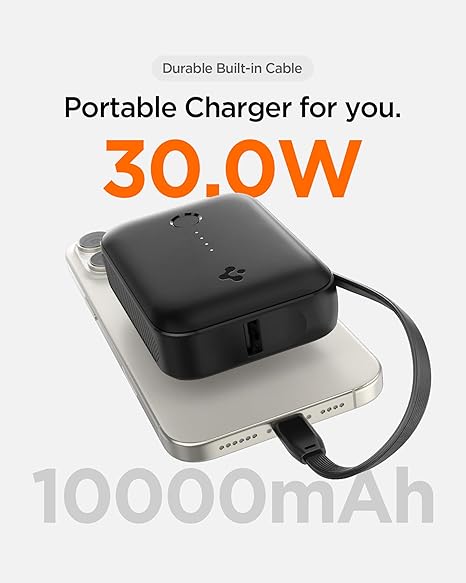Spigen ArcPack 10000mAh Power Bank with Built-in USB-C Cable,30.0W Fast Charging, 1 Type-C Cable, 1 Type-C Port, 1 USB-A Port - (ABS + PC | Black)
