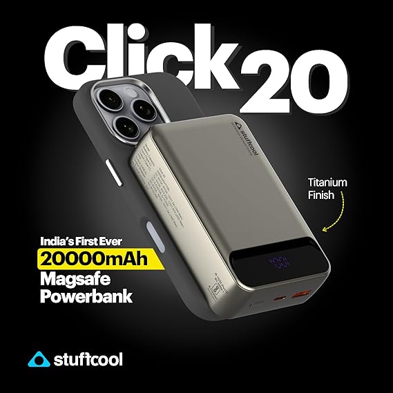 Stuffcool Click 20000mAh Magnetic Wireless Powerbank Natural Titanium Finish Perfect for iPhone 16,15,14,13,12 (Grey)