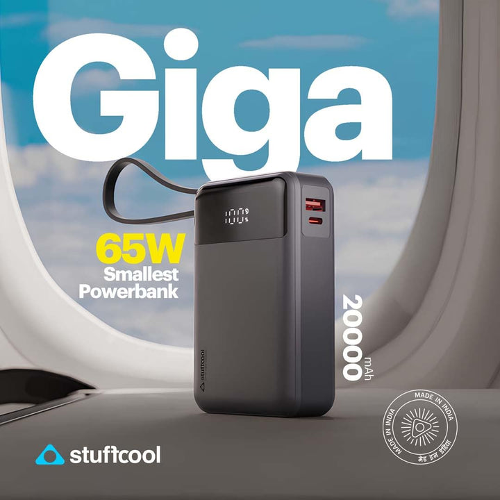 - [Proudly Made In India]:Proudly Made in India and BIS Certified, the GIGA 65W Powerbank offers the smallest yet most efficient 20,000mAh power solution for all your charging needs. With support for Samsung Super Fast Charging, iPhones, Pixels, and more, stay powered wherever you go.