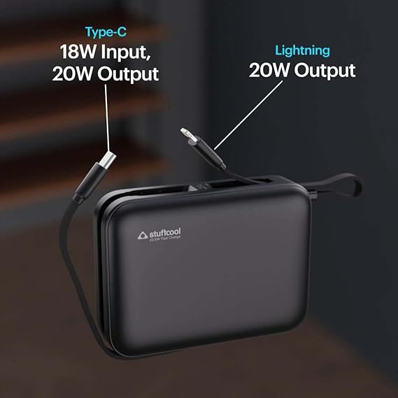 Stuffcool Maverick Mini 20,000mAh Powerbank with 20W Built-in Lightning & Type-C Cables, 22.5W USB-A Fast Charging (Black)