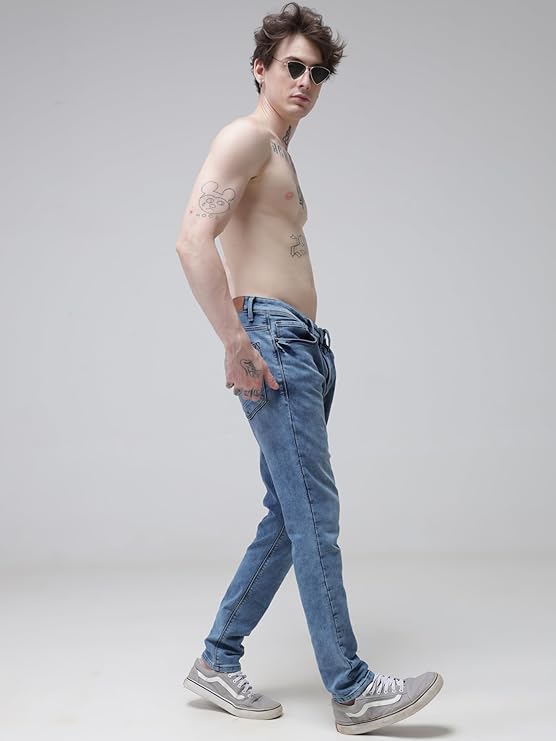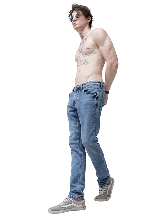 TURMS Men's Black Solid Mid Rise Stretchable Adventure Comfort Denim Pant Cotton Rich Jeans 30 Days No Wash Tailored Fit Casual Wear (Light Blue)