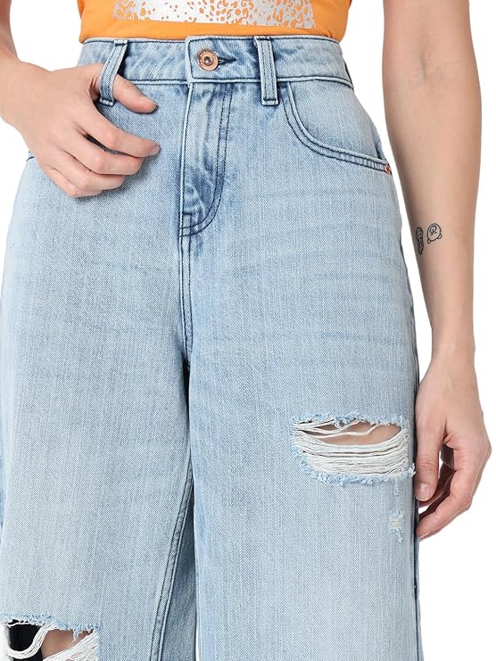 VERO MODA Women Cotton Wide Leg High-Rise Mildly Distressed Heavy Fade Cropped Jeans (Light Blue)