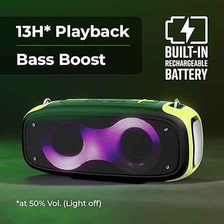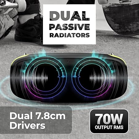 - Up to 9H* backup time (at 50% volume) / Deep bass with dual passive radiators , Charging time -3.5 H